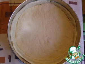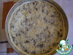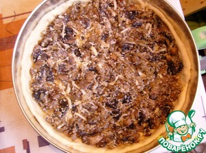 Лук нарезать полукольцами, грибы порезать дольками или пластинками (как Вам нравиться) и обжарить вместе на смеси растительного и сливочного масел, смешать с 100 гр. сыра, потертого на мелкой терке, выложить на тесто