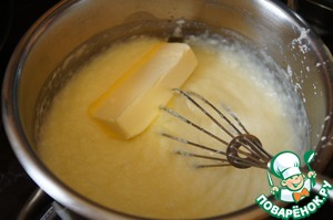 Выливаем горячее молоко в чашку с яичной смесью, интенсивно мешая. Переливаем все вместе обратно в кастрюльку, добавляем молочно-кокосовую смесь и варим, помешивая, до загустения. У меня ушло 3-4 минуты на среднем огне. Снимаем с огня, добавляем сливочное масло, после того как масло растает, вымешиваем и ставим кастрюльку в холодную воду до остывания. Чтобы не образовалось пленочки периодически помешиваем крем, либо накрываем пищевой пленкой поверхность крема.
