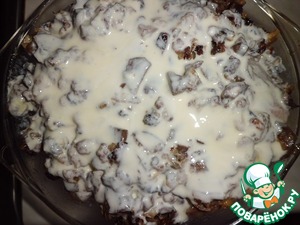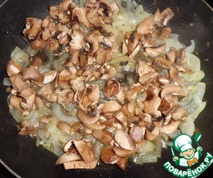 Обжариваем лук, нарезанный полукольцами, с добавлением грибов, до полуготовности. Солим, перчим.