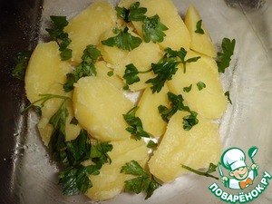 Картофель я отварила до полуготовности, нарезала крупными кружками, выложила на дно формы и посыпала зеленью. -