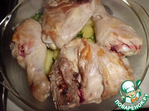 Хочу отдельно остановиться на картошке. В самом рецепте она отсутствует и курица готовится без нее. Но в целях экономии своего времени, я решила сделать 2 в 1 (тем более очень люблю подобные блюда).