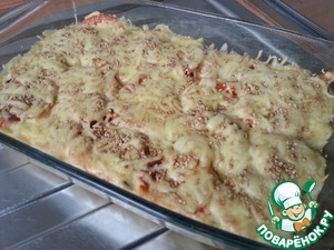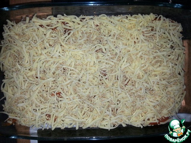 • 12. Накрыть все это тертым сыром, у меня это Гауда.