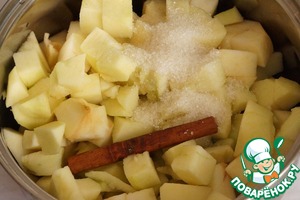 Яблоки помыть, очистить и нарезать некрупными кубиками. В сотейнике растопить масло, добавить туда яблоки, 1 ст. ложку сахара, 50 мл. рома, палочку корицы (можно её натереть), перемешать, проварить яблоки помешивая минут 10-15 пока не выпарится вся жидкость. Охладить.