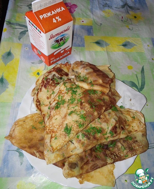 Как только низ блинчика схватился, выкладываем на одну его сторону начинку.