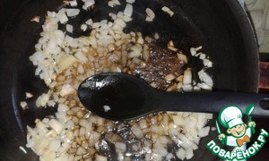 • Лук обжарить до золотистого цвета, в конце добавить соевый соус