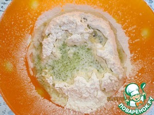 Муку просеять в миску, сделать углубление, добавить все ингредиенты для теста.