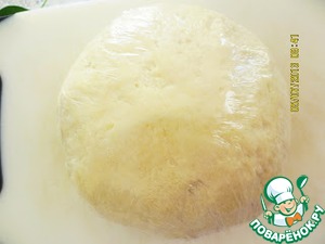 Тесто развернуть, обмять и разделить на две равные части. Раскатать две круглые лепешки.