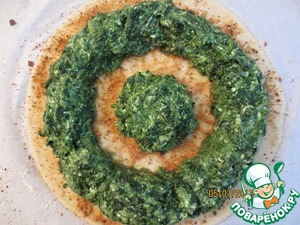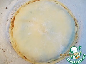 Застелить противень бумагой для выпечки и положить одну лепешку. Поверхность лепешки посыпать панировочными сухарями. -