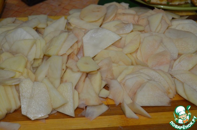Очистить картофель. Нарезать на тоненькие пластинки