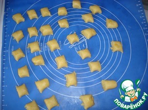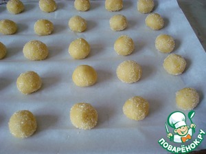 Лист выстелить пергаментом, скатать шарики, обмакнуть их в сахар и поставить в холодильник на 30 минут. затем выпекать в разогретой до 180 градусов духовке в течение 15 минут.