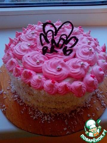 Верх я решила украсить итальянской меренгой. Недавно научилась ее делать, теперь применяю везде. А делать ее очень просто. Белки кладем в миксер и включаем на медленую скорость. Воду смешаем с сахаром. Лучше всего брать кастрюльку с тонким дном. Ставим на огонь. Сахар растворился, огонь убавляем на средний. Белки взбиваем на самой большой скорости. Все это делаем одновременно. То есть, включили белки, поставили кастрюльку. Кастрюлька стоит на плите 5 минут с момента закипания. Можно проверить, капнув каплю в холодную воду. Если будет шарик, то сироп готов. Я просто через 5 минут вливаю тонкой струйкой сироп в белки, не переставая взбивать. И продолжаем еще 5 минут взбивать. Получается хорошая стойкая меренга. Набираем ее в кулек кулинарный и украшаем торт.
