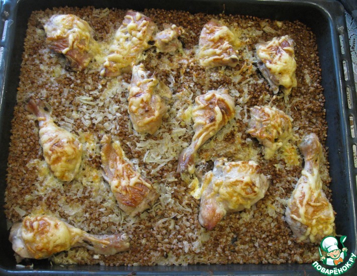 Примерно через минут 40-60 (зависит от вашей духовки) достаем противень и наслаждаемся ароматной сочной гречкой и не менее сочной курицей.