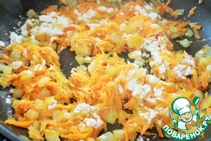Морковь и лук помыть почистить. Лук порезать кубиками. Морковь натереть на крупной терке. В сковороде растопить сливочное масло и обжарить на среднем огне лук и морковь до мягкости. Посыпать мукой овощи перемешать и тушить 1-2 минуты.