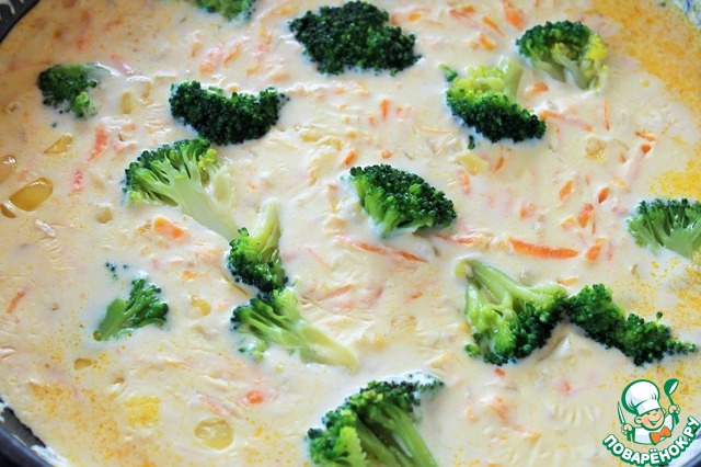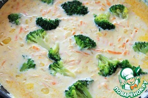 Брокколи разобрать на соцветия и ошпарить кипятком, дать постоять 3 минуты. Добавить молоко и сливки, соль сахар и перец. Убавить огонь до минимума и тушить еще 5 минут до густоты соуса.