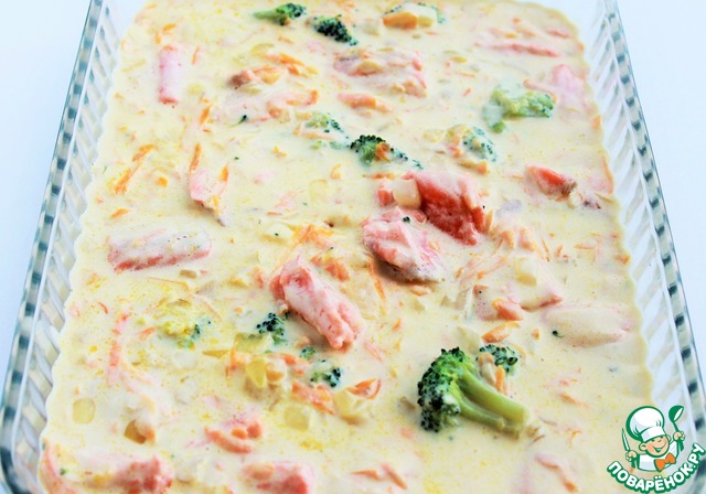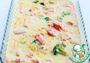 Далее свежею рыбу порезать на кусочки, добавить к овощам и тушить еще 2 минуты. Добавить брокколи.