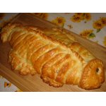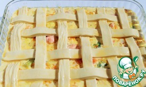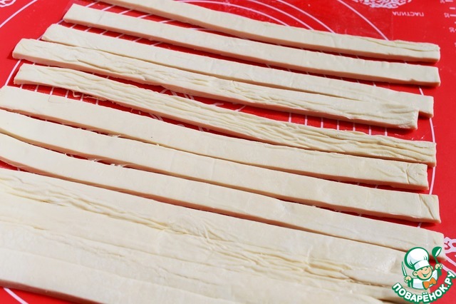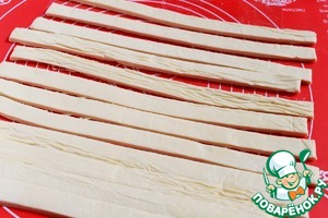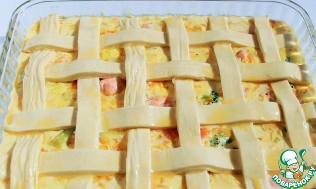 Сверху поместить полосы теста в виде плетения. Яйцо взбить и при помощи кисти смазать полосы теста.