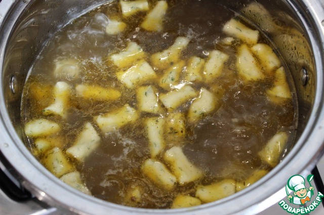 Отварить галушки в кипящем бульоне. Рекомендую разделить тесто на 2 части и отварить в два приема.