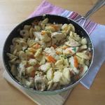 Готовые галушки отцедить на сито, прогреть их с курицей и овощами. Блюдо готово.