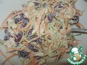 Все ингредиенты выкладываем в салатник, добавляем немного майонеза, перемешиваем.