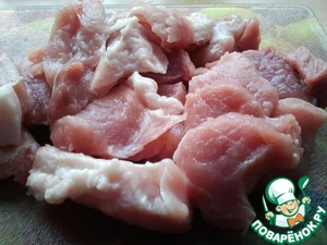 Мясо разрезать кусочками. Примерно 3-4 см. толщиной.