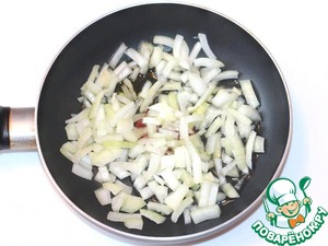 Приготовим соус. Разогреть в большой сковороде оливковое масло, обжарить до мягкости мелко нарезанную луковицу,