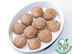 Из охлажденного фарша слепить шарики диаметром около 4 см, обвалять в панировочных сухарях. Выложить фрикадельки в формочку или на противень,