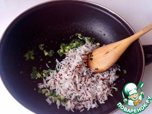 В той же глубокой сковороде (или в воке) разогреть 2 ст. л. растительного масла и перемешать с ним зеленый лук, прогреть 1 минуту.