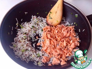Добавить к рису измельченный лосось, перемешать и прогреть 1 минуту.