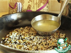 Затем добавляем бульон, солим и перчим по вкусу (только с солью поаккуратней, бульон и сыр могут быть тоже солёными), накрываем крышкой и варим до готовности риса.