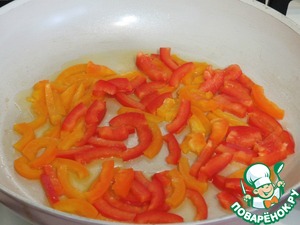 Болгарский перец нарезаем соломкой и обжариваем на оливковом масле 3-5 минут. Остужаем.