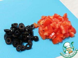 Помидоры очищаем от семян и нарезаем кубиками, оливки колечками.