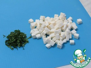 Сыр нарезаем кубиками, петрушку мелко рубим.