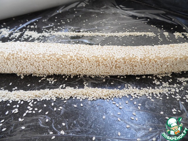 Затем на поверхности стола распределите кунжут 50гр. на всю длину бруска, и обвалять брусок со всех сторон, чуть нажмите на верхнюю грань, чтобы кунжут лучше прилип к нижней, и так все стороны