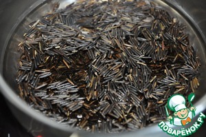 Заливаем полстакана дикого риса 1,5 стаканами воды, доводим до кипения и варим на медленном огне при закрытой крышке 50 минут до раскрытия зёрен.