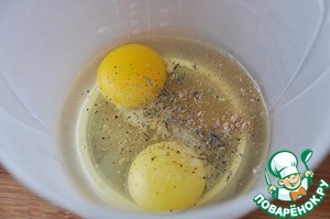 Берём яйца и белок одного яйца, добавляем соль, мускатный орех, сушёный тимьян, свежемолотую смесь перцев и взбиваем венчиком.