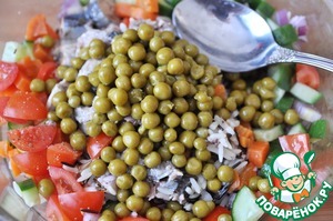 Добавляем к овощам зелёный горошек, оливковое масло, перемешиваем.
