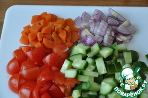 Нарезаем кубиками варёную морковь, красный лук, помидоры черри и огурец. -