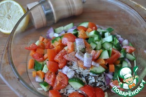 Овощи смешиваем с остывшим рисом, солим, добавляем свежемолотую смесь перцев, поливаем соком лимона.