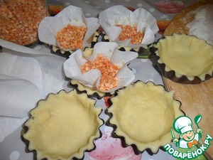 Сверху выложить на бумагу слой гороха или фасоли и выпекать 15 минут при температуре 180 градусов.