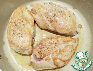 На разогретой сковороде на оливковом масле обжариваю куриное филе с двух сторон до золотистой корочки (примерно по 6 минут с каждой стороны) на среднем огне.