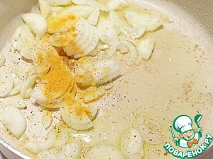 В ту же сковороду, где жарилось филе, выкладываю репчатый лук, нарезанный полукольцами, добавляю соль и молотый черный перец по вкусу, куркуму.