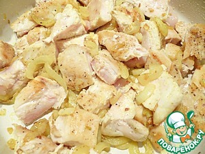 Возвращаю в сковороду куриное филе, перемешиваю с луком, примерно через минуту снимаю сковороду с плиты.