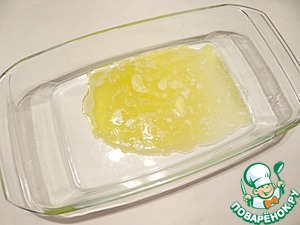 Для выпечки этой запеканки я использую прямоугольную стеклянную форму. В форму наливаю оливковое и растопленное сливочное масло, хорошо смазываю дно и края формы.