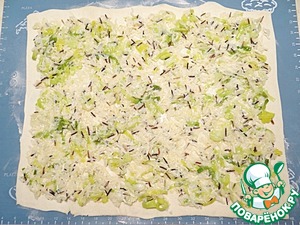 Тесто слоеное бездрожжевое я разрезаю на 2 равные части (можно приготовить этот пирог и из целого куска слоеного теста, но тесто раскатывается тонко, поэтому целый пирог трудно переносить на противень), с помощью муки для подпыла раскатываю тесто толщиной около 3-х мм, выкладываю ровным слоем начинку, чуть отступая от краев.