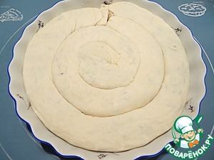 Форму смазываю растительным маслом, выкладываю рулет "улиткой" (и тут я сделала ошибку - чуть прижала пирог, т. к. хотела распределить пирог по всей поверхности формы, а так как я пеку такой пирог не первый раз, то знаю, что в разрезе он должен получаться более воздушным, чем вышел в этот раз).
