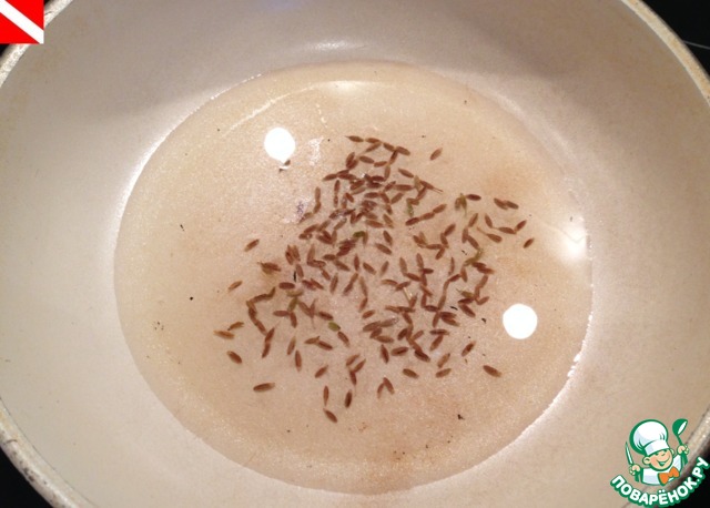 • В это время на сковороду наливаем немного оливкового масла, нагреваем. Всыпаем семена кумина (зиры) по вкусу, обжариваем их секунд 30