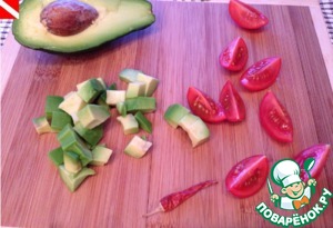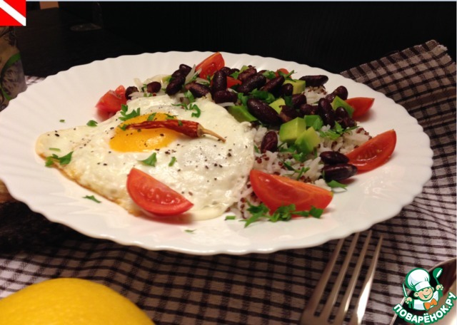 • Далее на блюдо для подачи выкладываем крупу, фасоль, кусочки авокадо, черри, маринованный лук. Сверху сбрызгиваем немного оставшимся маринадом.