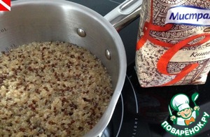 Тщательно промываем киноа. Крупа может горчить, так как семена покрыты слоем сапонинов, поэтому её лучше замочить на несколько часов и промыть, прежде чем готовить. Заливаем водой 1:2, доводим до кипения и варим на медленном огне 15 минут.