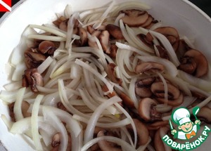 Тем временем приступим к приготовлению начинки. Шампиньоны и лук режем, обжариваем до готовности лука на оливковом масле.