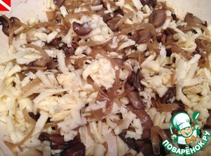 В оригинальном рецепте использовался козий сыр, у меня адыгейский. Сыр измельчаем и смешиваем с луково-грибной начинкой. Солим, перчим по вкусу, добавляем любимые приправы, например, кумин.